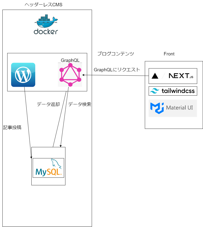 ここが今回の肝になる部分で、WordPressを「ヘッダーレスCMS」として使用しています。簡潔に言うと、ブログの管理機能だけをWordPressに持たせて、表示だけはNextJsにお願いしています。